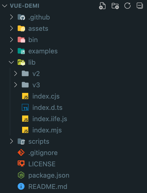 可以看出, vue-demi 支持 cjs , iife , mjs 三种类型的引用方式( CommonJS , <script> , ESModule ).