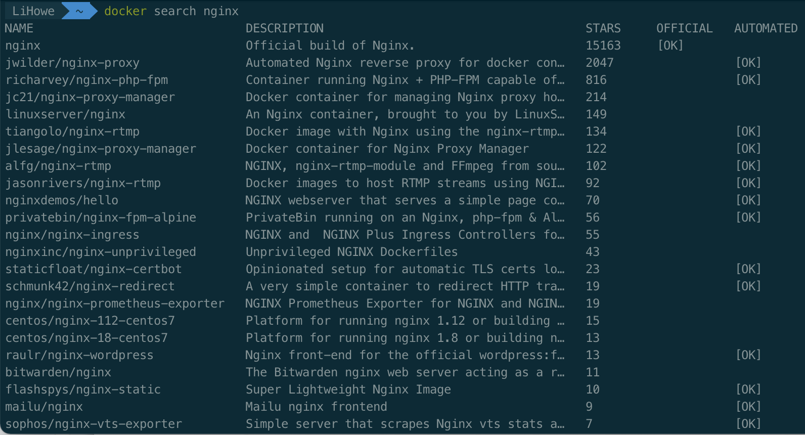 执行docker search nginx命令后, 会展示出以nginx为搜索关键词的所有镜像