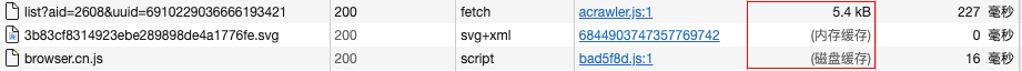 红框标出的 内存缓存 和 磁盘缓存(英文分别为from memory, from disk)即为浏览器缓存