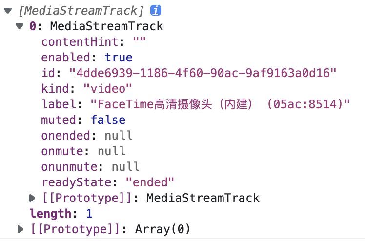enabled: 唯一可以更改的属性, 用来控制轨道的启用与否, 我们可以通过更改该属性来开关摄像头以及麦克风id: 对象唯一标识kind: 轨道的类型, 音频:audio, 视频:videolabel: 轨道数据源对应的设备标识muted: 是否因为技术问题而无法提供媒体数据(非传统静音含义)readyState: 轨道状态"live": 激活态, 轨道提供实时数据"ended": 结束态, 轨道将不再提供新数据