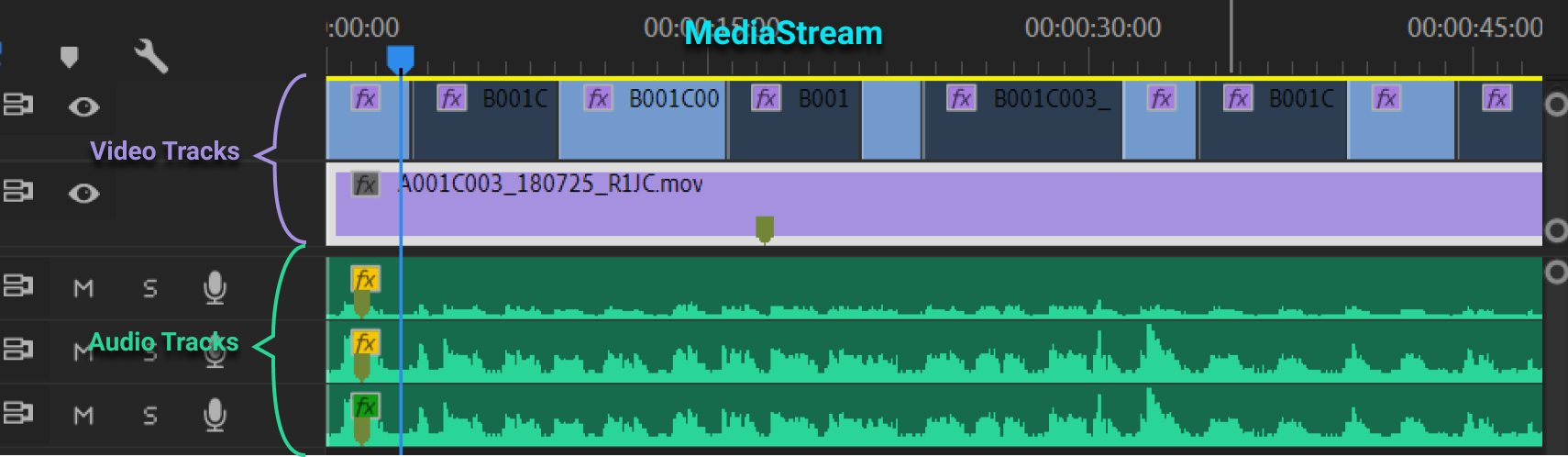 以常见的剪辑软件(Adobe Pr)为例, 可以看出, 一个媒体流对象(MediaStream)中包含一个或多个媒体轨道(MediaTrack)