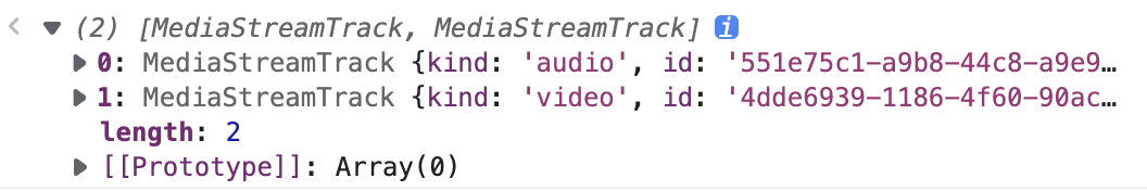 获取全部音频轨道, 如上图中kind为audio的轨道对象getVideoTracks()